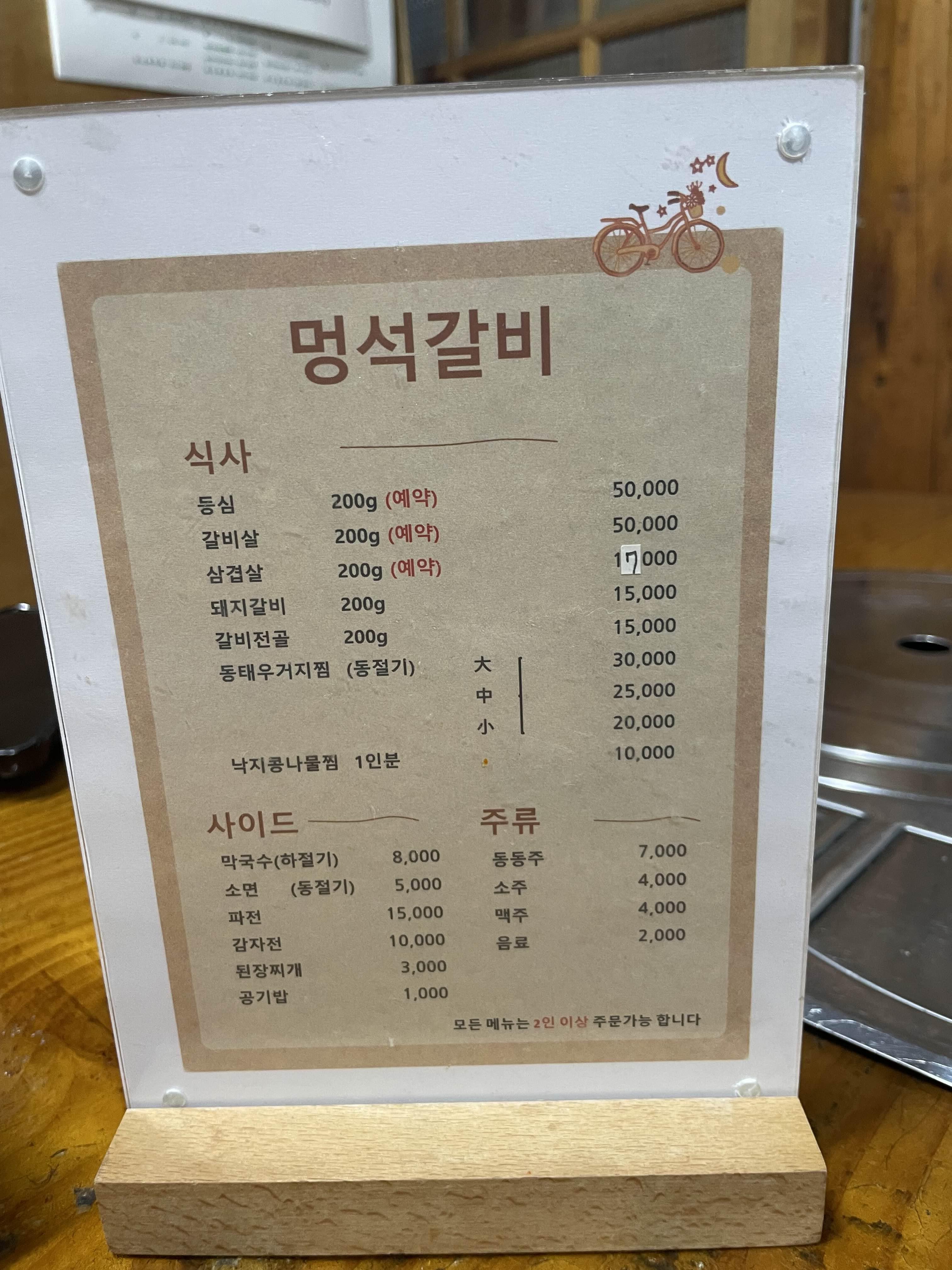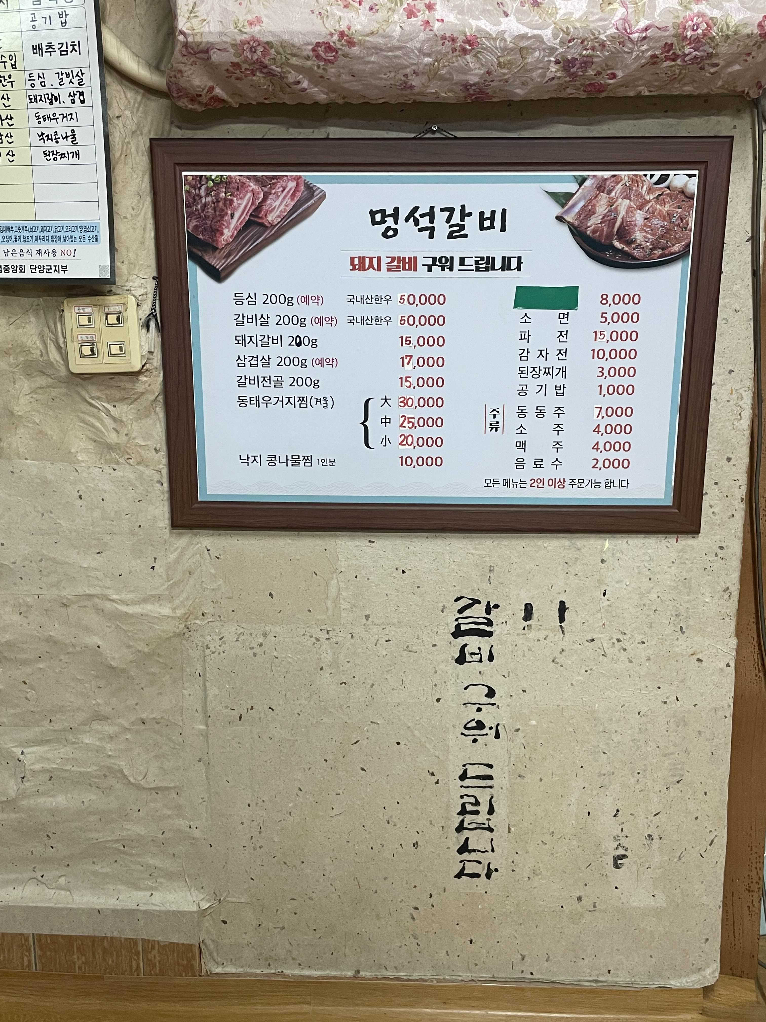 제천 멍석갈비 메뉴판입니다. 다양한 메뉴가 있었지만, 저희는 2명이서 방문하였기에, 돼지갈비 2인분을 주문했습니다. 귀동냥으로 추측컨대 가족이 운영하는 식당 같습니다. 직원분들이 굉장히 친절해서 좋았습니다. 이러한 부분은 손님으로서 굉장히 좋은 인상으로 다가오는 것 같습니다.